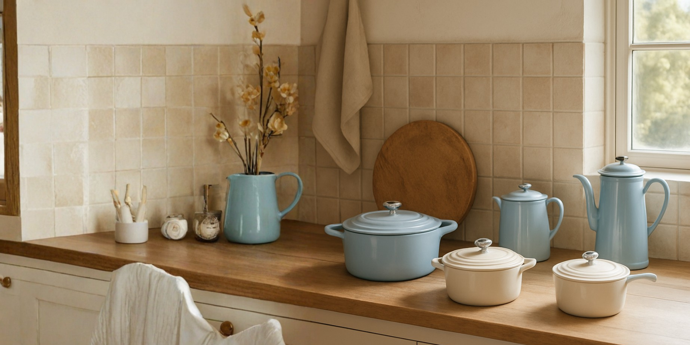 Premium enamelled cast iron cookware, blending French design with lasting quality.